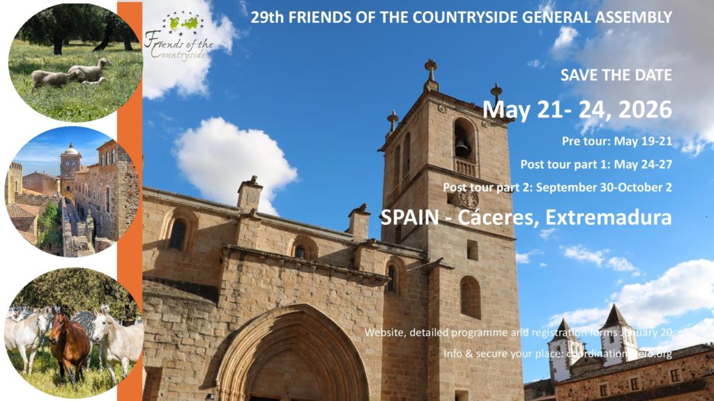 We are pleased to announce that the 29th Friends of the Countryside General Assembly will take place in Cáceres, Extremadura, Spain from May 21 to 24, 2026. A pre-tour is planned from May 19 to 21, with a post-tour from May 24 to 27. Please mark your calendars, further information will follow soon.